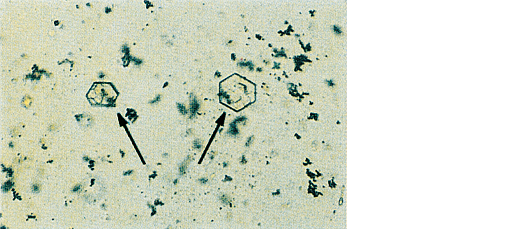 尿沈渣の顕微鏡写真を別に示す。矢印で示す結晶はどれか。