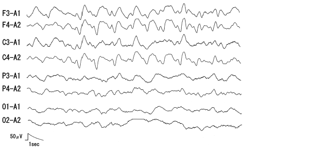 46歳の男性。3時間前から意識障害をきたしている。脳波を示す。