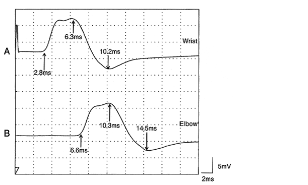 前腕の手首(A点)と肘(B点)で正中神経を電気刺激した際に短母指外転筋から得られた複合筋活動電位を示す。A点とB点の距離は21cmであった。この神経の運動神経伝導速度(m/s)はどれか。