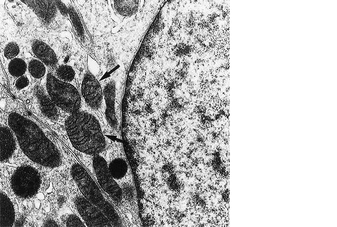 細胞の電子顕微鏡写真を示す。矢印で示すのはどれか。