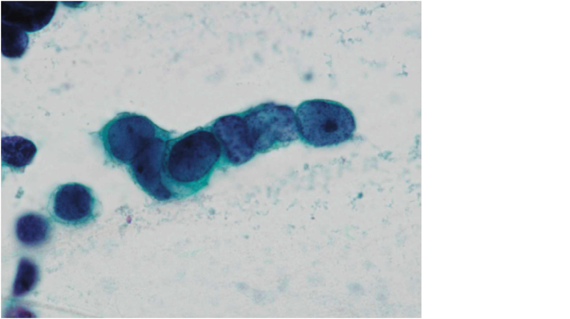気管支擦過細胞診のPapanicolaou染色標本を示す。