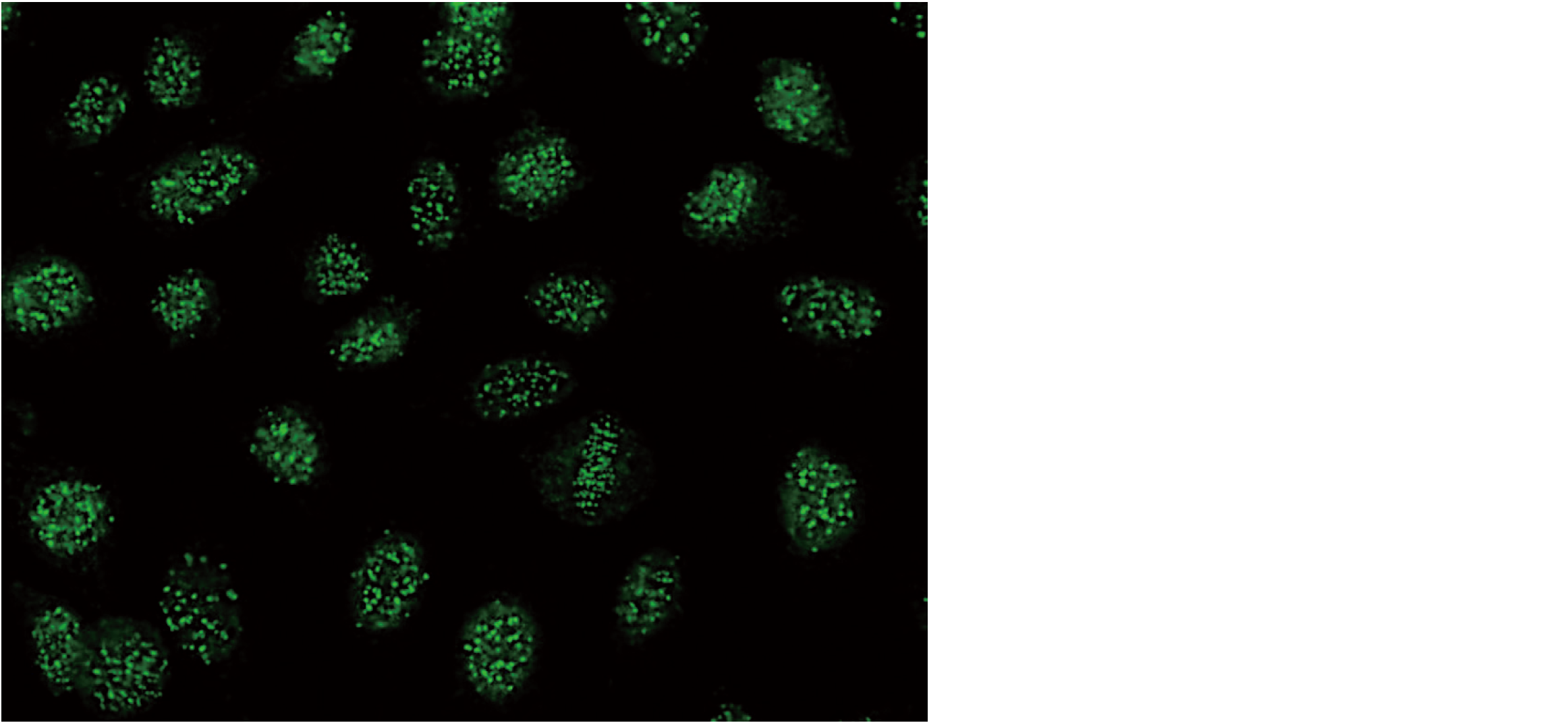 HEp-2 細胞を核材に用いた抗核抗体の蛍光抗体法による染色写真を示す。
