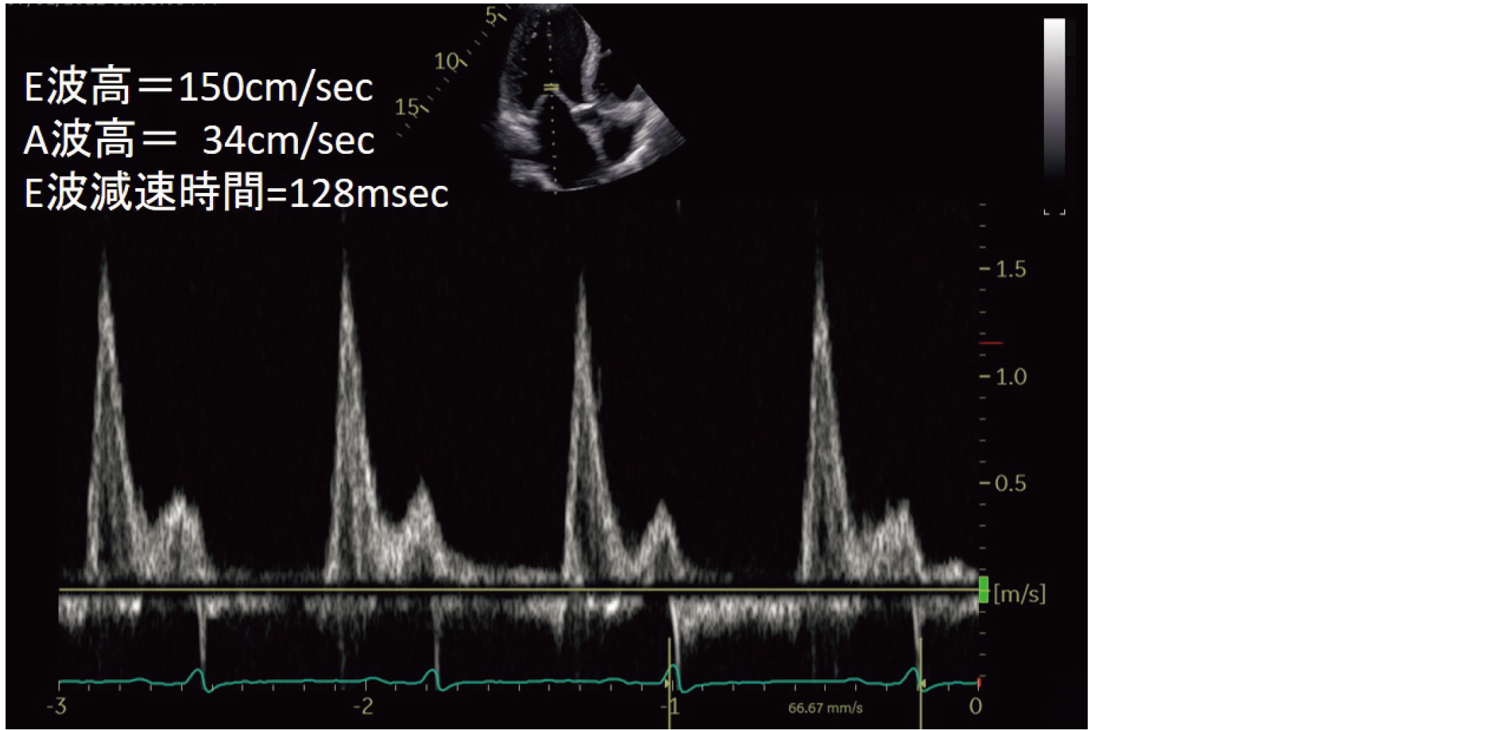 78歳の男性。心不全患者の左室流入血流速波形と計測値を示す(ID 2023024,ID 2023025共通)。
