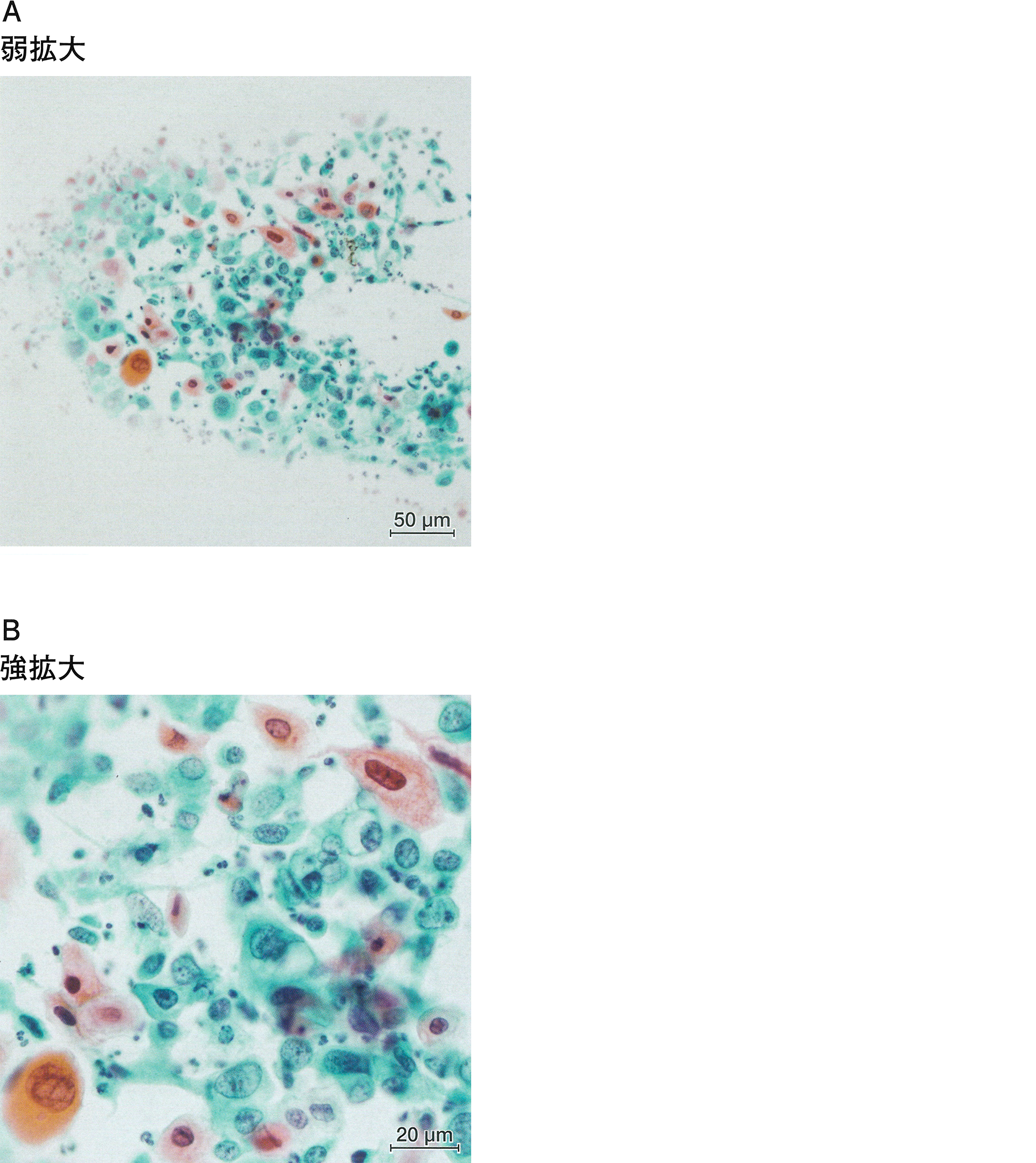 子宮頸部細胞診のPapanicolaou染色標本の弱拡大写真(A)と強拡大写真(B)を示す。