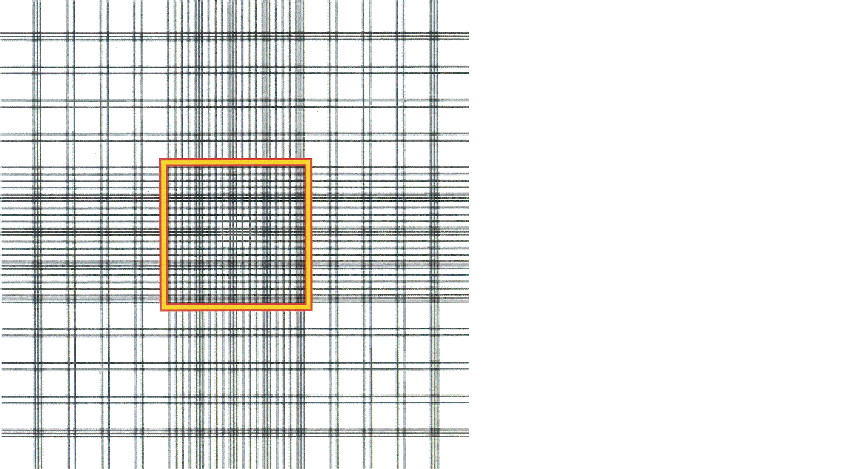 血小板数をBrecher-Cronkite法にて目視した。用いた計算板(Burker-Turk)の区画を示す。100倍に希釈した血液を用いた図中オレンジ色枠内の任意の5つの中区画のカウントは(14,16,13,12,15)であった。