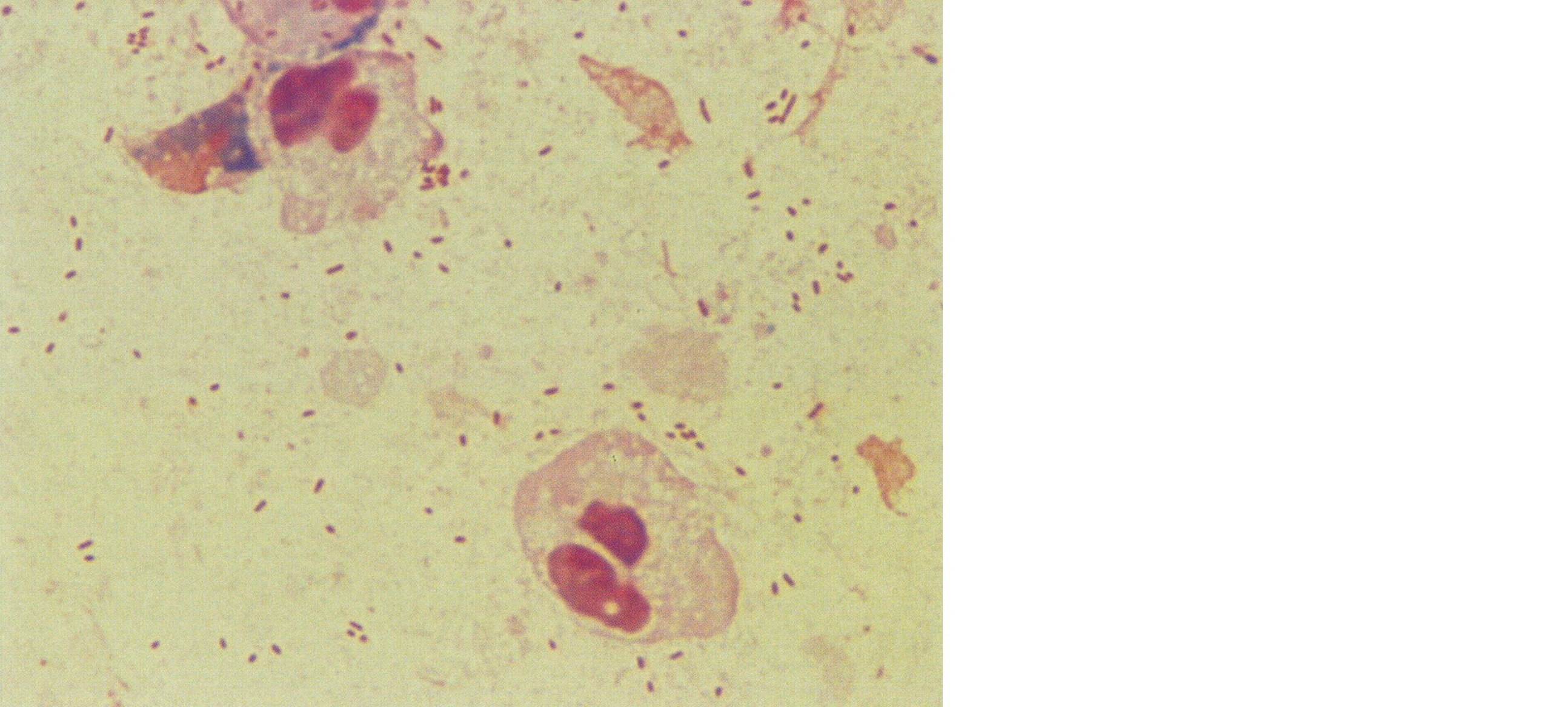 市中肺炎が疑われた患者の喀痰のGram染色標本を示す。分離菌はヒツジ血液寒天培地に発育しなかった。