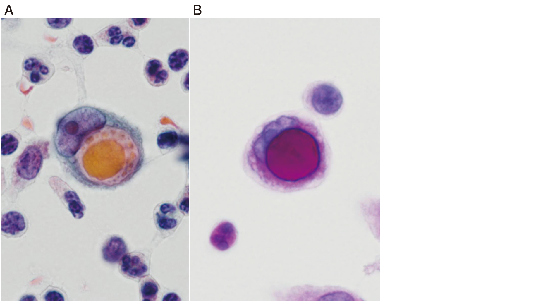腹水細胞診のPapanicolaou染色標本(図A)とPAS反応標本(図B)を示す。