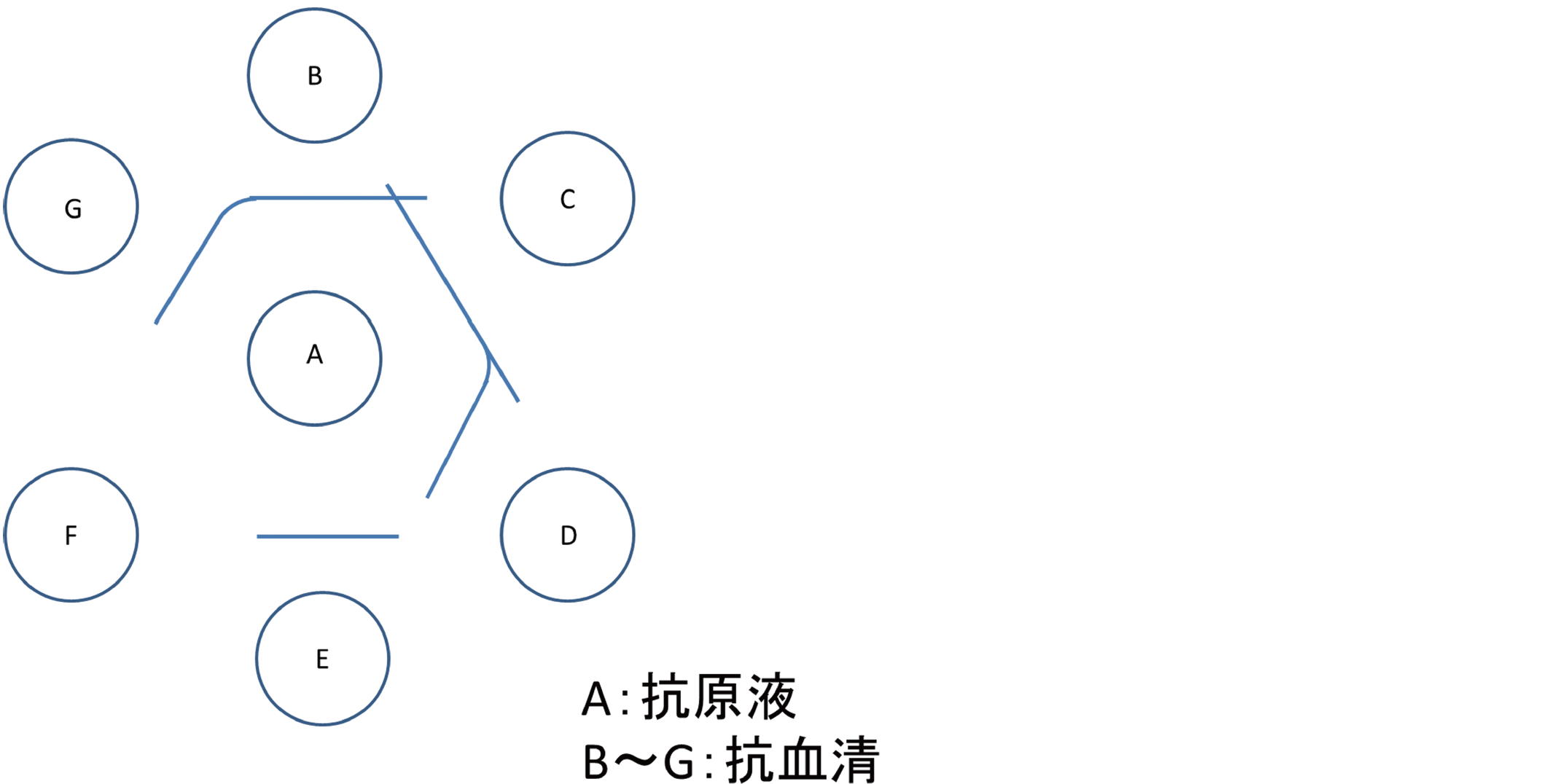 Ouchterlony法〈二重免疫拡散法〉の結果の模式図を示す。