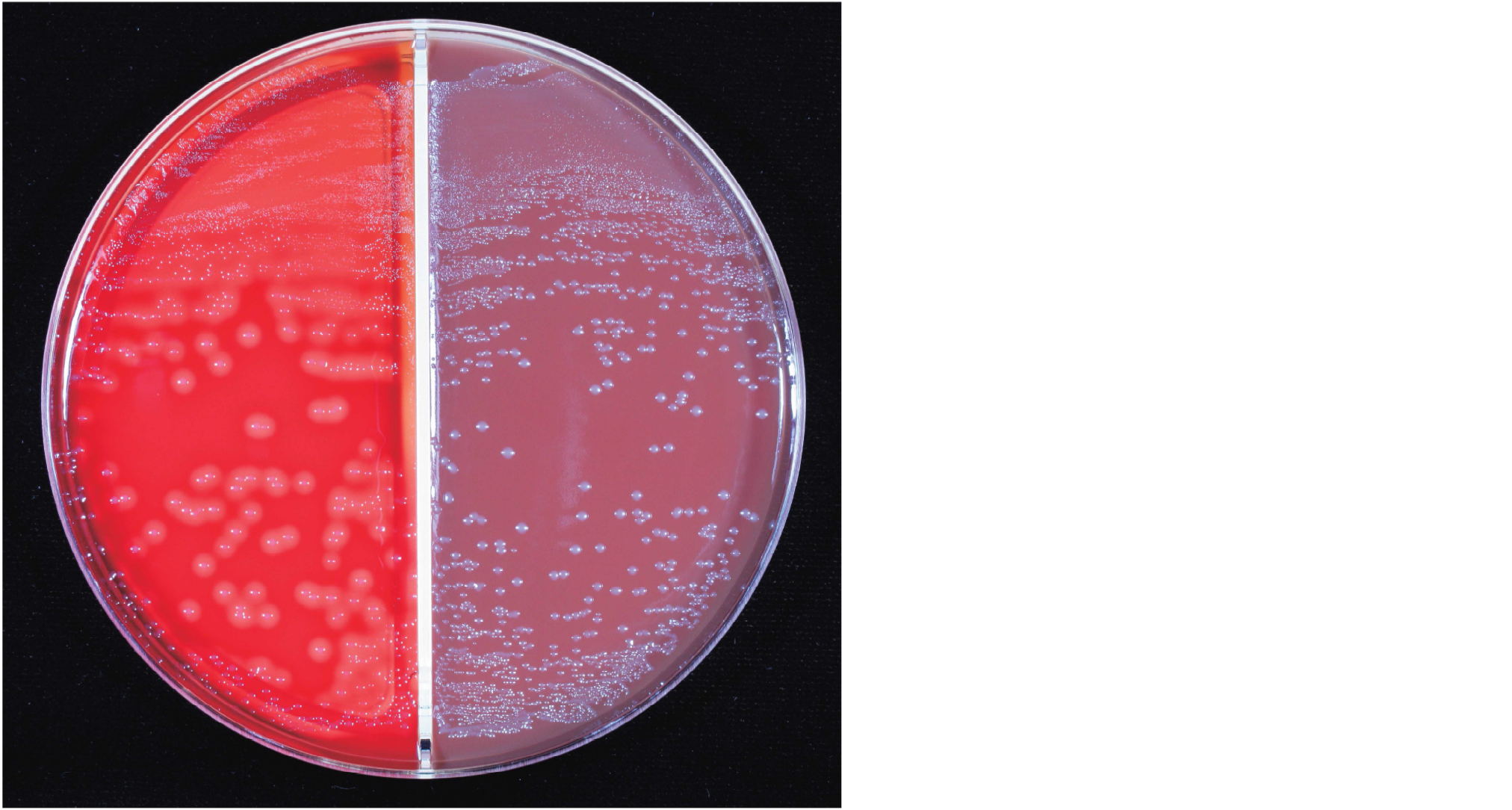 急性咽頭炎患者の咽頭粘液を5%ヒツジ血液寒天培地(左)とチョコレート寒天培地(右)の分画培地に接種し,35℃で24時間炭酸ガス培養を行った培地を示す。分離菌は,グラム陽性球菌,カタラーゼテスト陰性,LancefieldのA群抗原陽性であった。