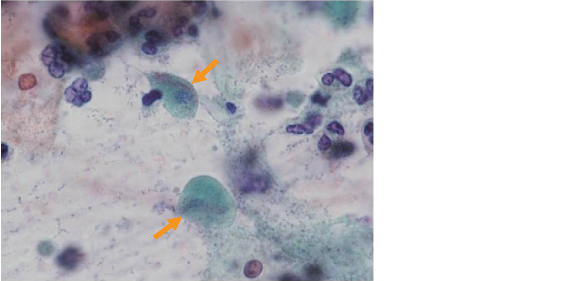 子宮頸部擦過細胞診のPapanicolaou染色標本を示す。