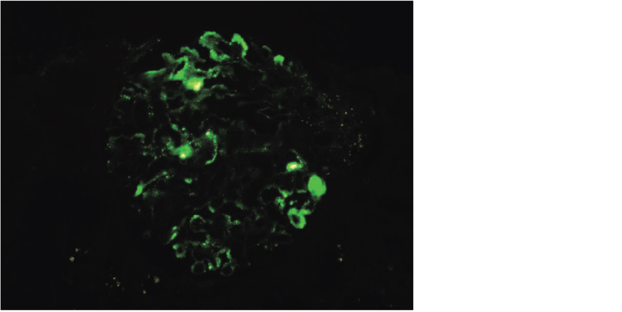 30 歳の女性。出産後に発熱が続き,蝶形紅斑および蛋白尿を認めたため入院した。腎生検を行い,蛍光抗体法によってC1qを染色した結果を示す(ID 2018083,ID 2018084共通)。