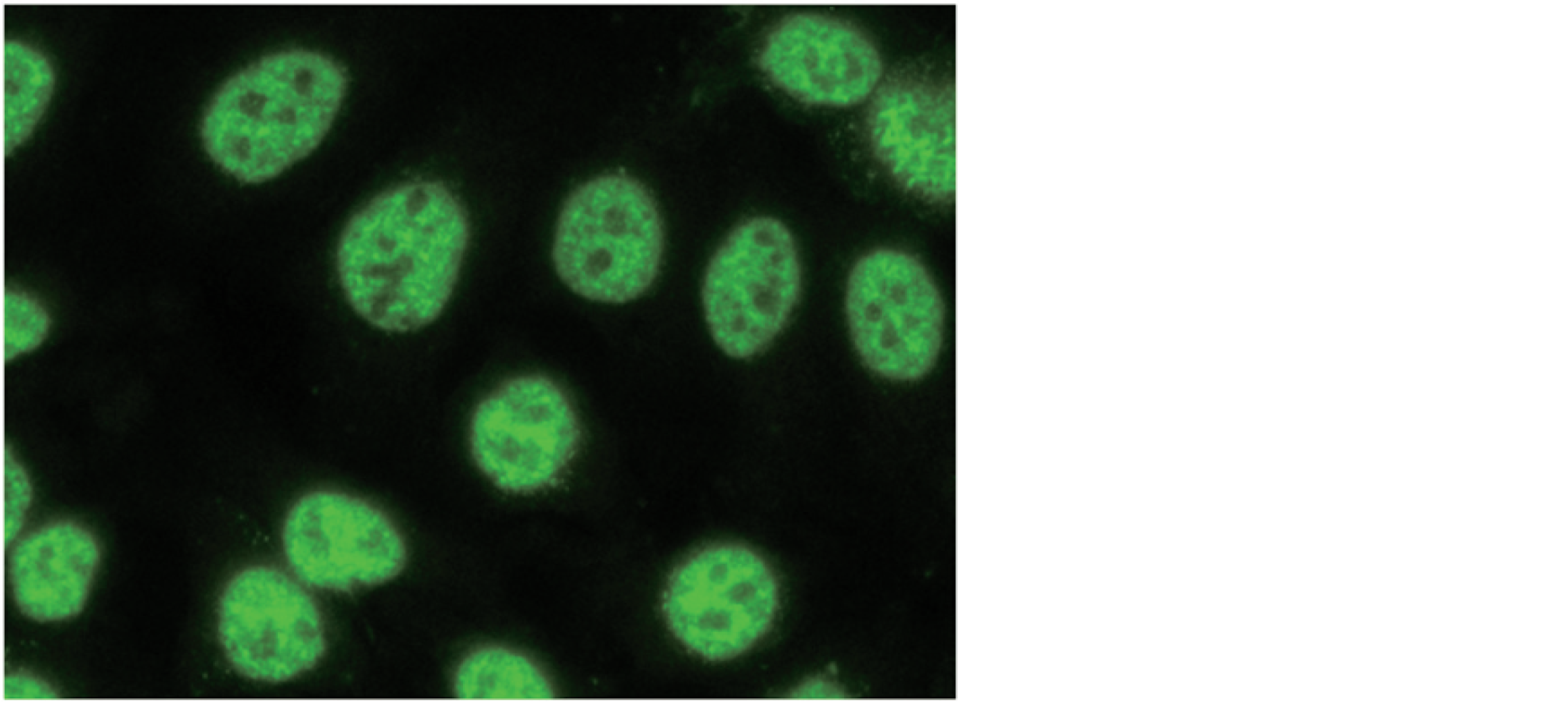 間接蛍光抗体法による抗核抗体検査所見を示す(ID 2019182,ID 2019183共通)。