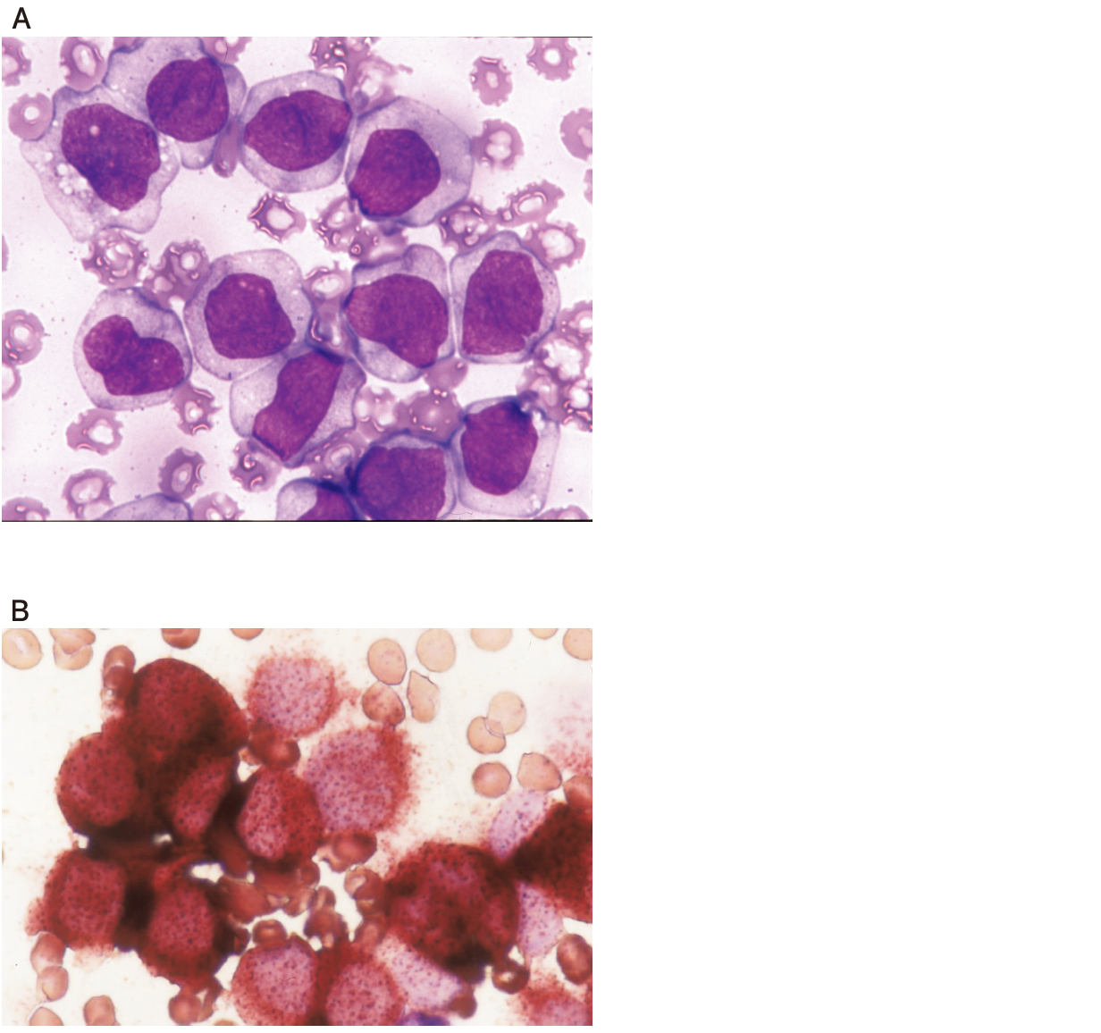 末梢血のWright-Giemsa 染色標本(図A)とエステラーゼ二重染色標本(図B)を示す。