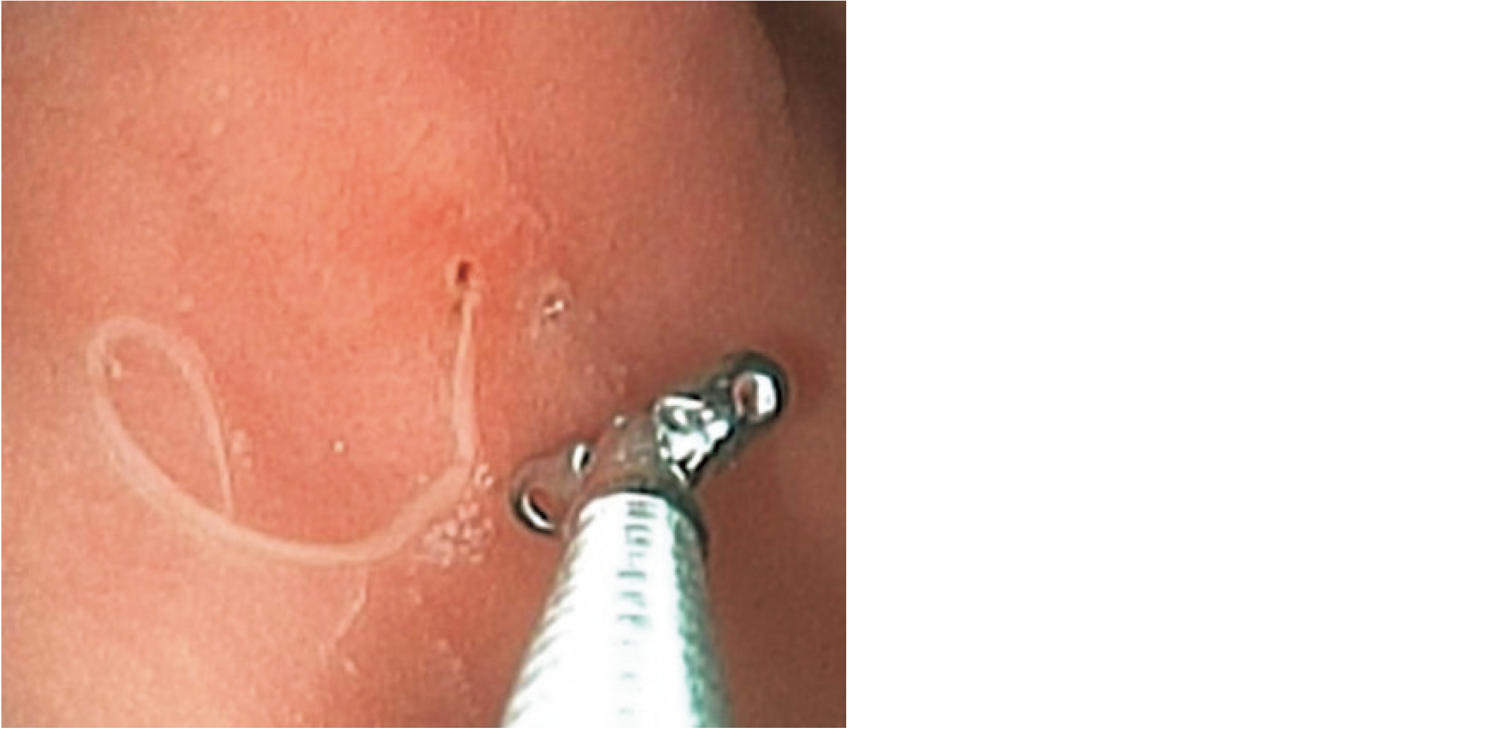 夕食にしめ鯖を摂取後,深夜に激烈な腹痛を訴えた。上部消化管の内視鏡像を示す。
