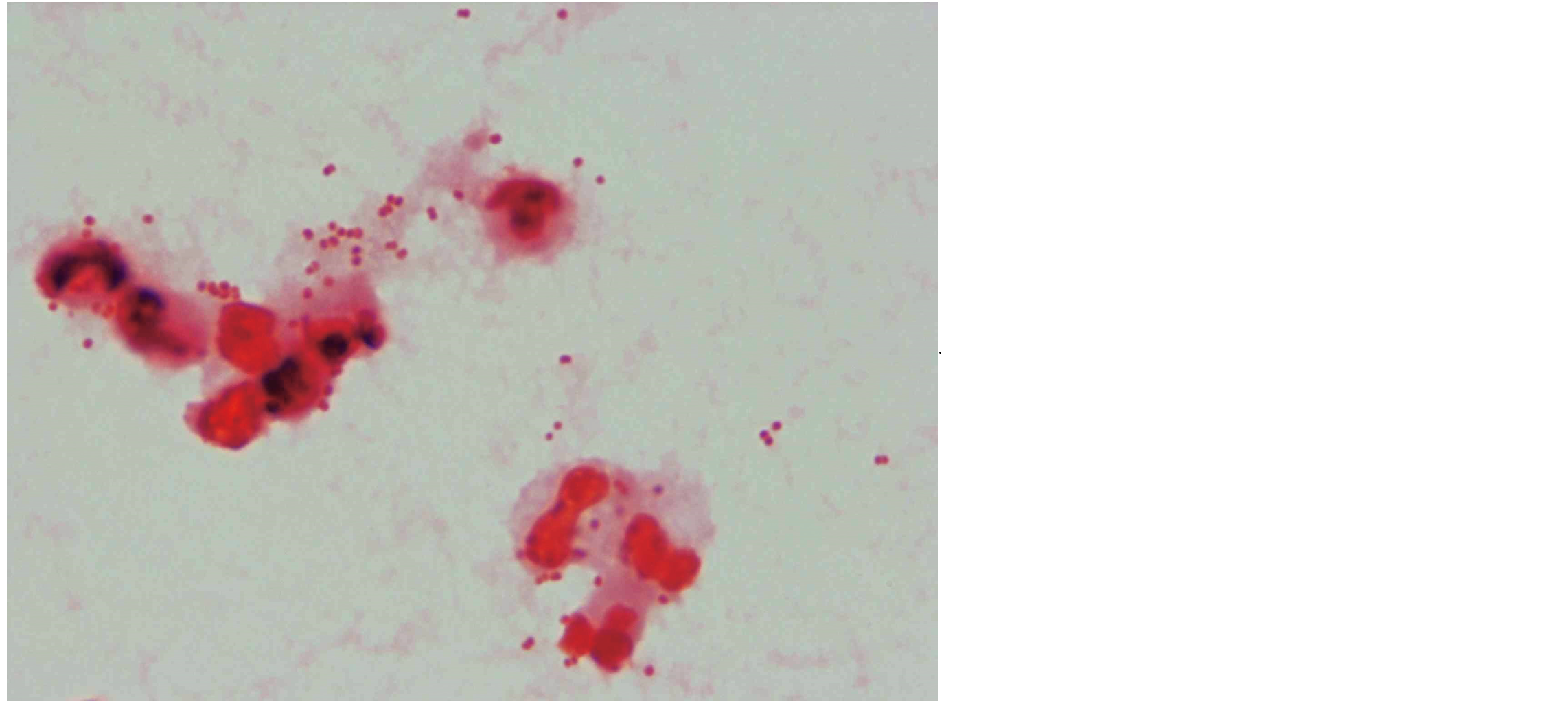 髄液のGiemsa染色標本を示す。分離菌はヒツジ血液寒天培地に発育し,グルコース及びマルトースを分解した。