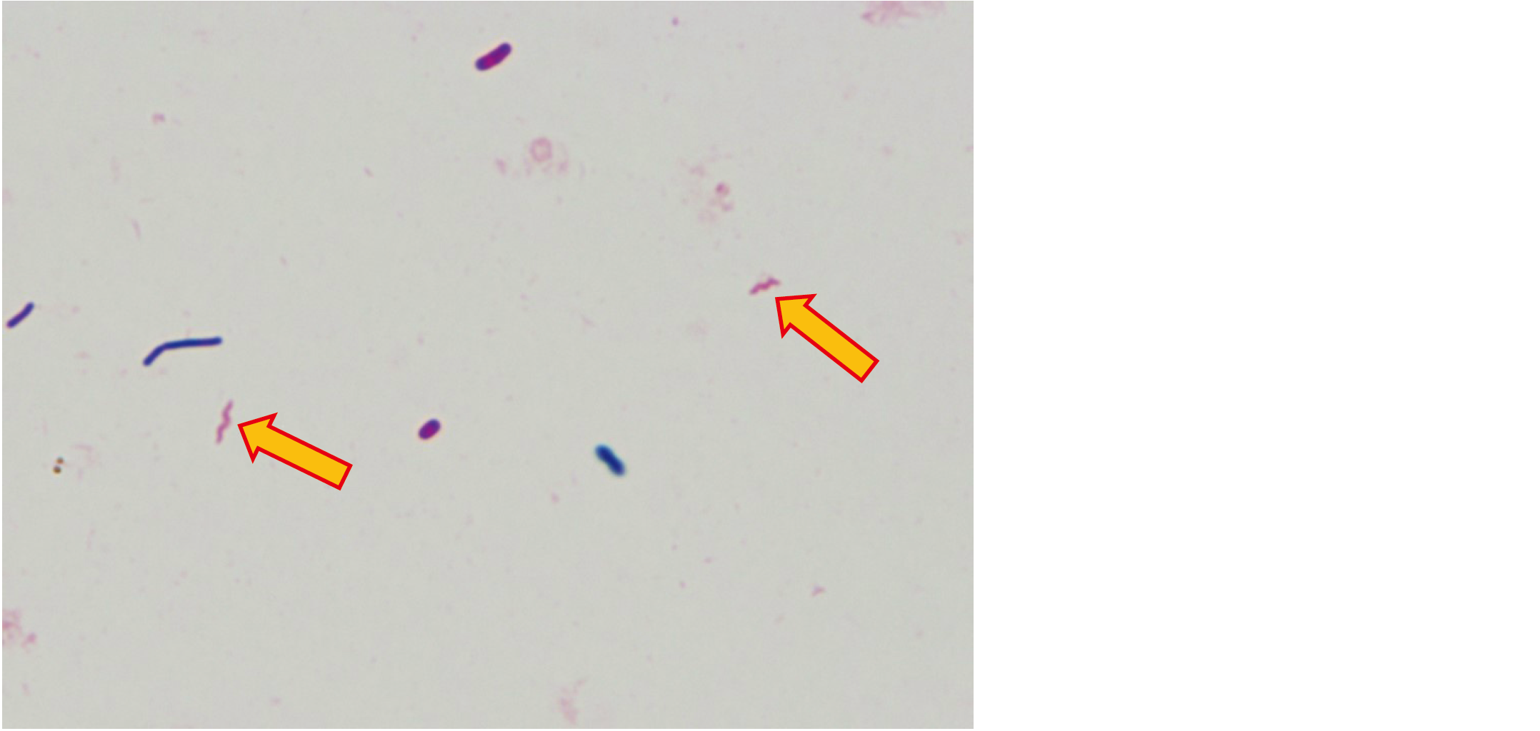 腸管感染症患者の下痢便のGram染色標本を示す。