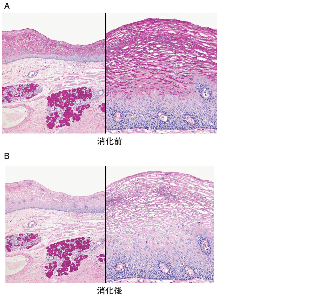 食道のPAS染色標本とα-アミラーゼ消化後のPAS染色標本を示す。
