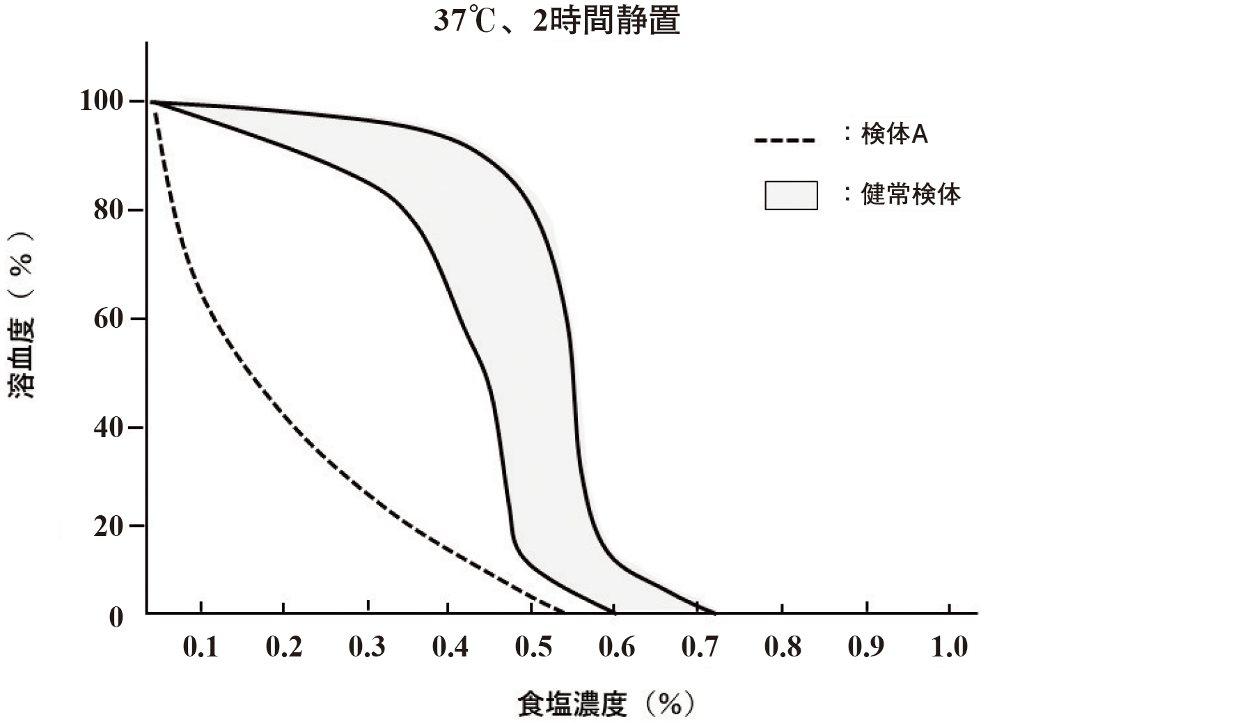 緩衝食塩溶液の希釈系列に検体A(ヘパリン血)を滴下後37℃で2時間静置した。その溶血度(%)と食塩濃度(%)の関係を示す。
